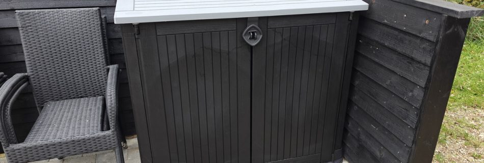Miniskur: Der er nu kommet et miniskur til opbevaring af vores havemøbler. Se på billederne hvordan stolene placeres, så de kan være der.Der er en lås på skabet – mest for at dørene ikke skal blæse op. Koden til låsen er 0-0-0. Pas godt på vores havemøbler!